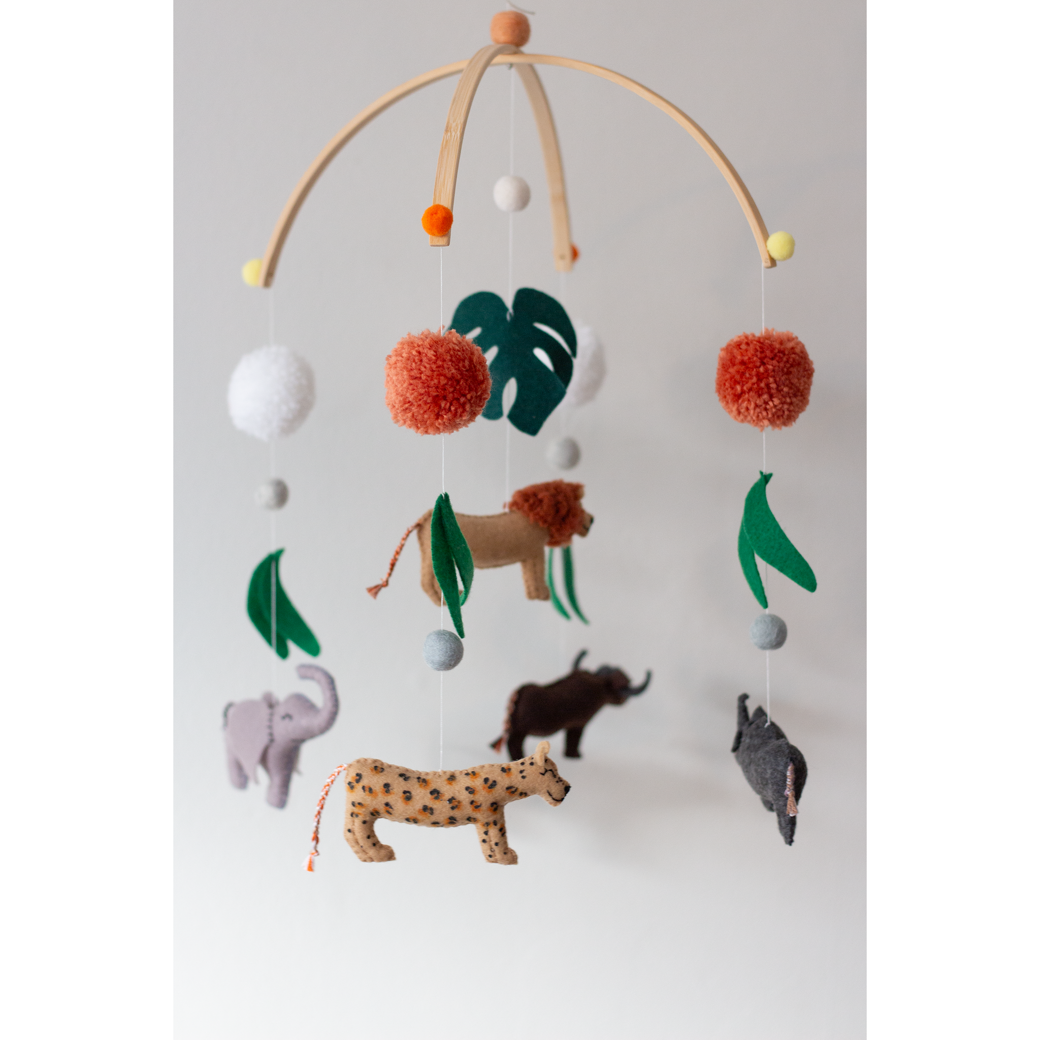 This handcrafted mobile features the iconic Big 5 animals (Lion, Leopard, Rhino, Elephant, Buffalo) carefully made from soft felt, hanging from a bamboo cross frame. Adorned with felt balls and pom-poms, it adds a playful touch to your baby's space, while ideal for creating a calming, nature-inspired atmosphere while igniting your little one's curiosity and love for wildlife.